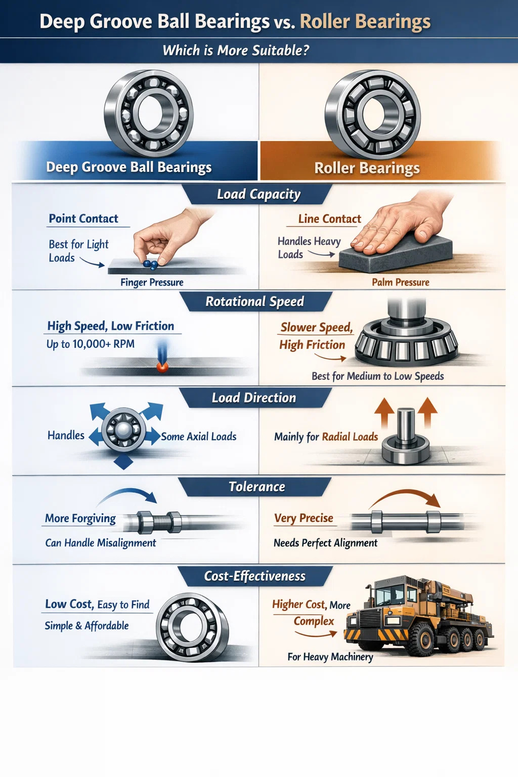 Sa mundo ng mga bearings, walang ganap na "kung alin ang mas mahusay," tanging "kung alin ang mas angkop." Deep groove ball bearings at ang roller bearings ay parang running shoes at hiking boots – bawat isa ay may kanya-kanyang lakas.
